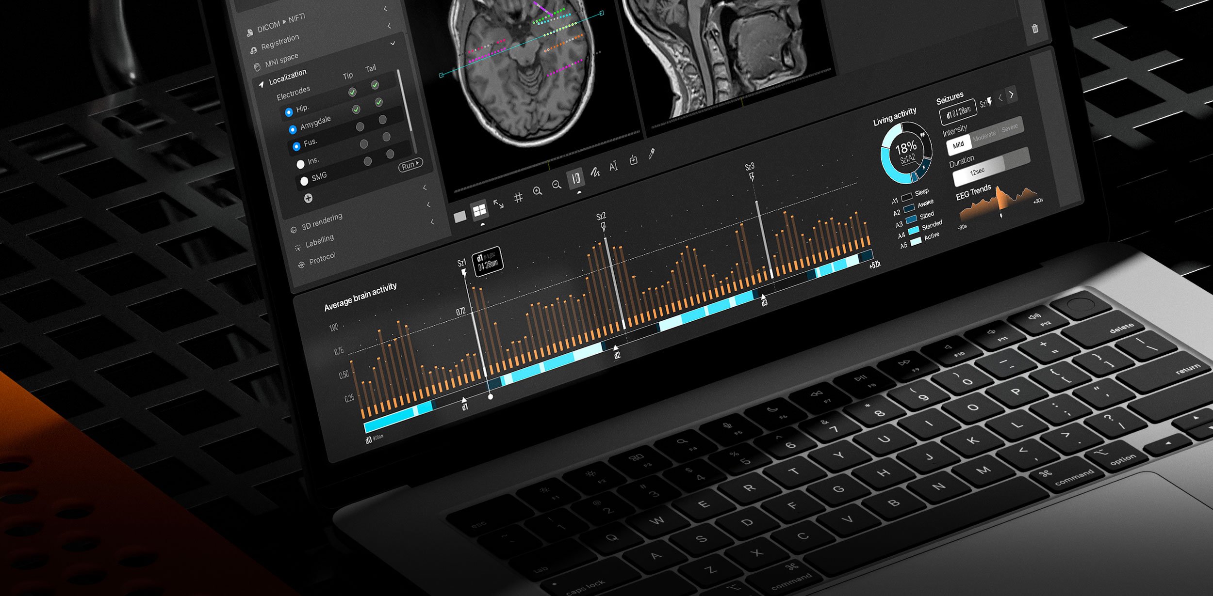 I designed CORTEO’s complete visual identity—naming, logo, systems, motion, and templates—alongside a high-fidelity interactive prototype. Brain imaging and EEG data informed UI logic and aesthetics, supported by custom 3D brain visualizations developed with a CGI specialist.